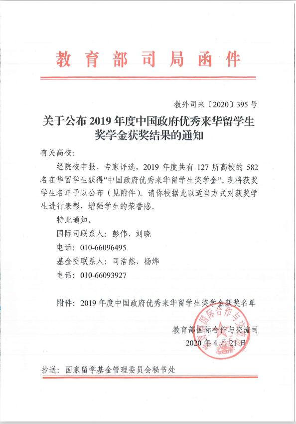 Recently, Department of International Exchange and Cooperation of the Ministry of Education issued the document, "Notice on the Awarding List of the Chinese Government Outstanding International Student Scholarship of 2019", in which SHAH BISMILLAH ( Sha Feiyu as his Chinese name), a student from our university, won the award.