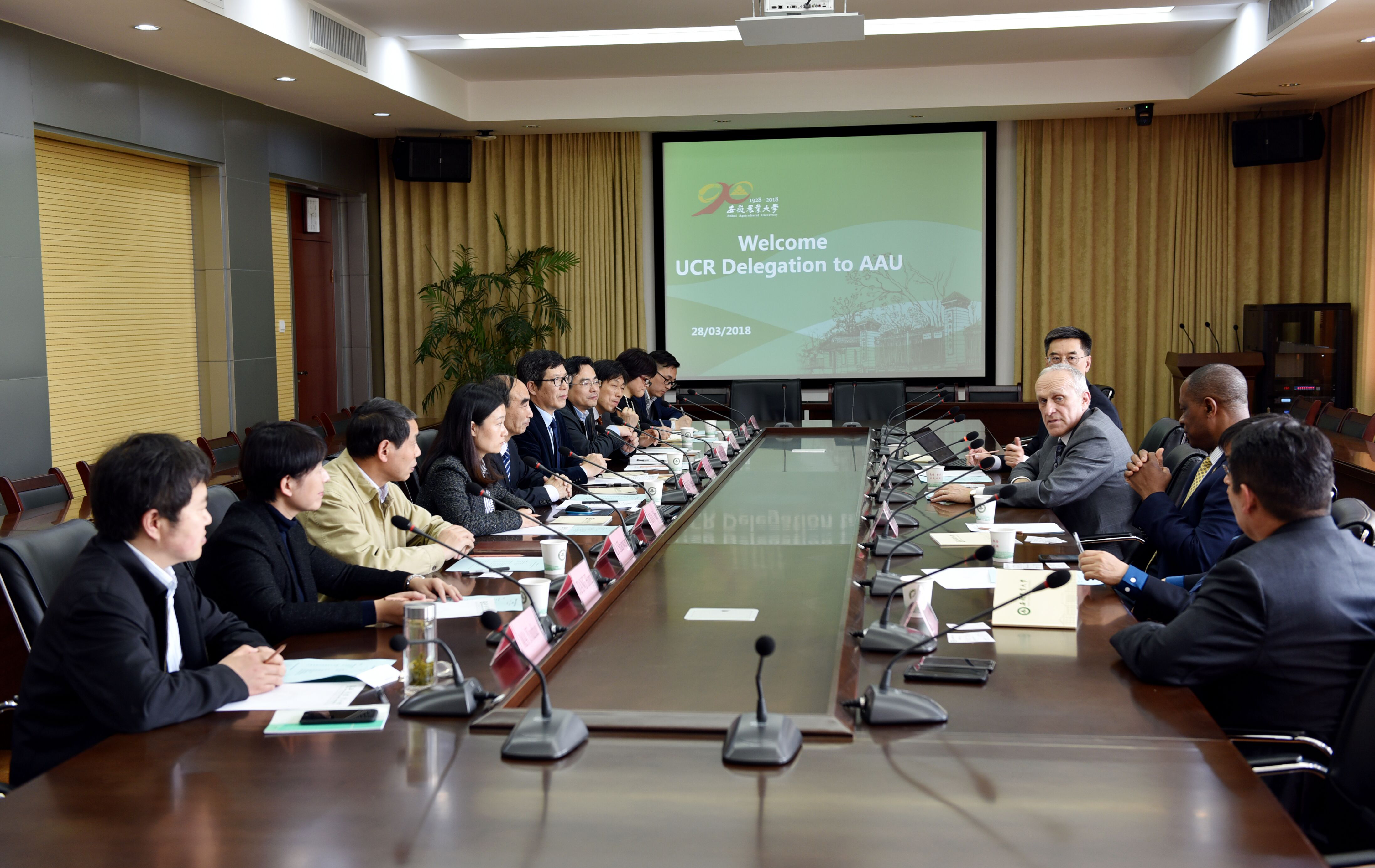 On March 28th , King Wilcox, President ofUniversity of California, Riverside, visited our university along witha delegation composed of theVice Academic Dean, Dean of School of Economics and Management, Director of Department of Chemistry, andProgram Officer. A cooperative meeting was held, hosted by Yao Zuowen, Vice President of AAU. Cheng Beijiu, President of AAU,attended the meeting, so did the directors of related departments,including thePersonnel Department, Department of Science and Technology, Office of Academic Affairs, Graduate Office, New Rural Development Research Center, International Office and School of Science.